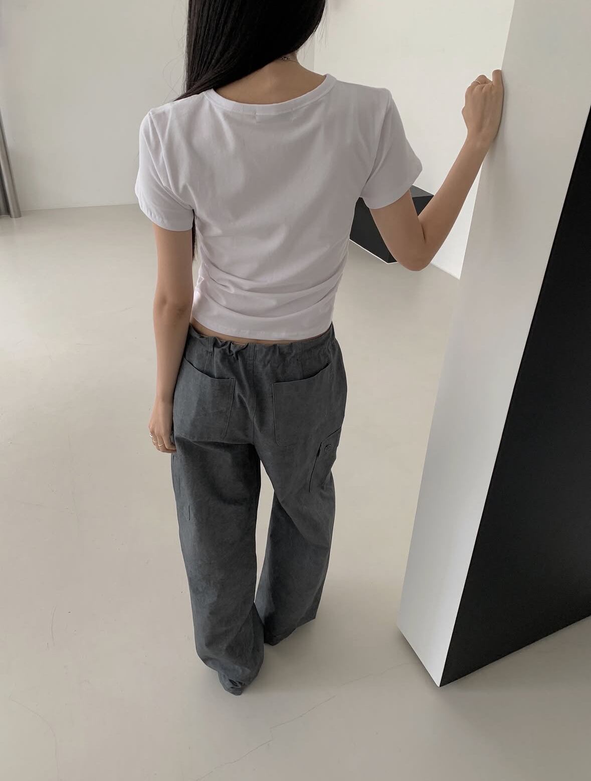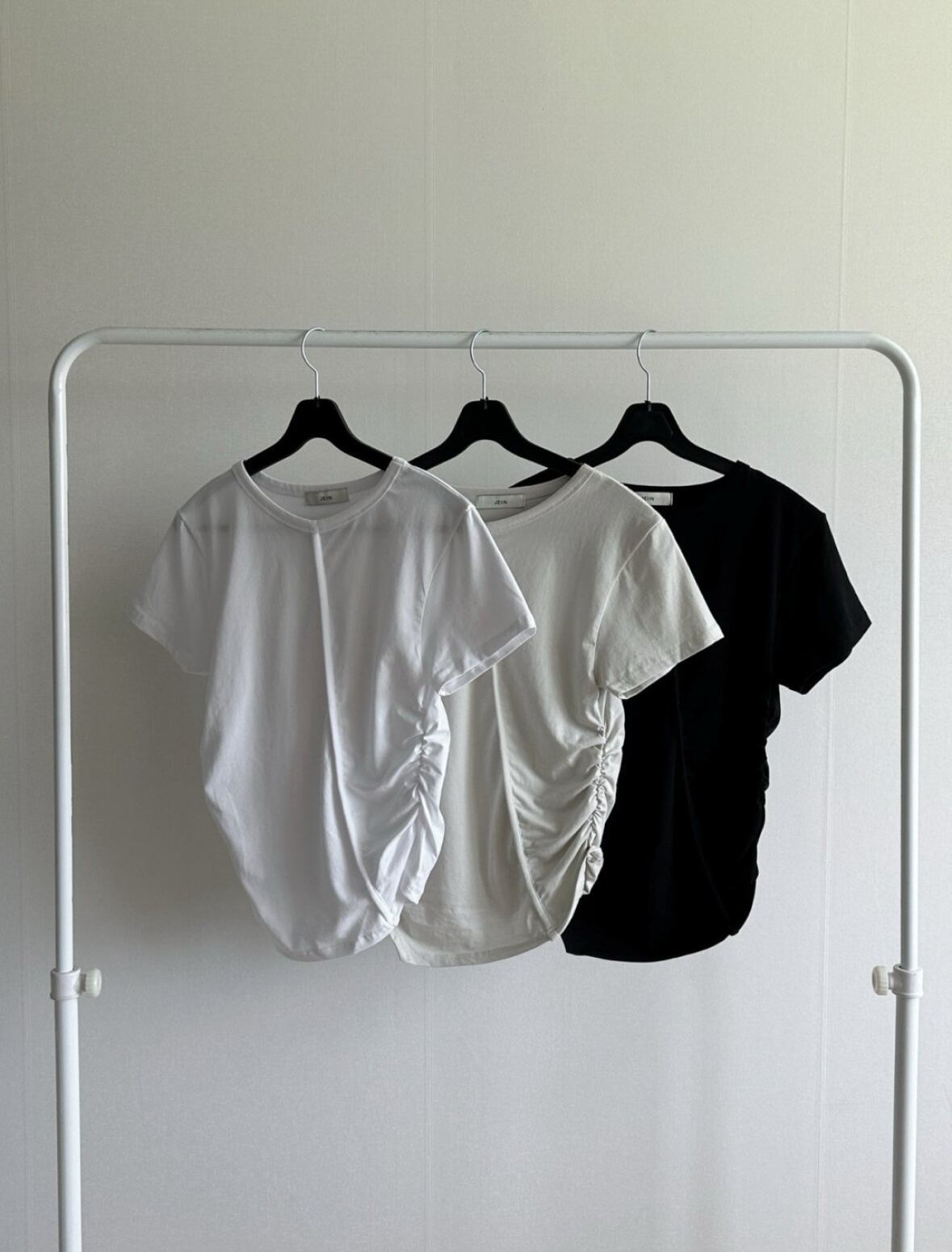 両脇のクシャっとした加工がさりげなく立体感を演出し、体のラインをすっきり見せてくれます。